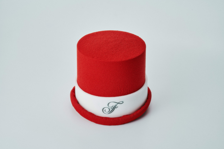 ベルスタッフのシルクハットから着想を得た「スカーレット シルクハット」は、ヴァローナ社のチョコレートを贅沢に使用した芸術的なケーキ。