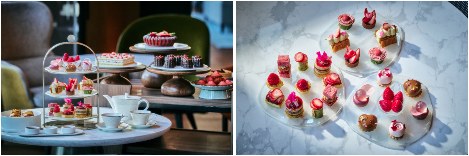 薔薇のように美しくあしらったストロベリーミルククリームのムースは、滑らかな口当たりと優しい甘みが魅力。チョコレートガナッシュの濃厚なコクといちごの爽やかな酸味が調和するタルトなど、心ときめくスイーツが華やかにティースタンドを彩ります。