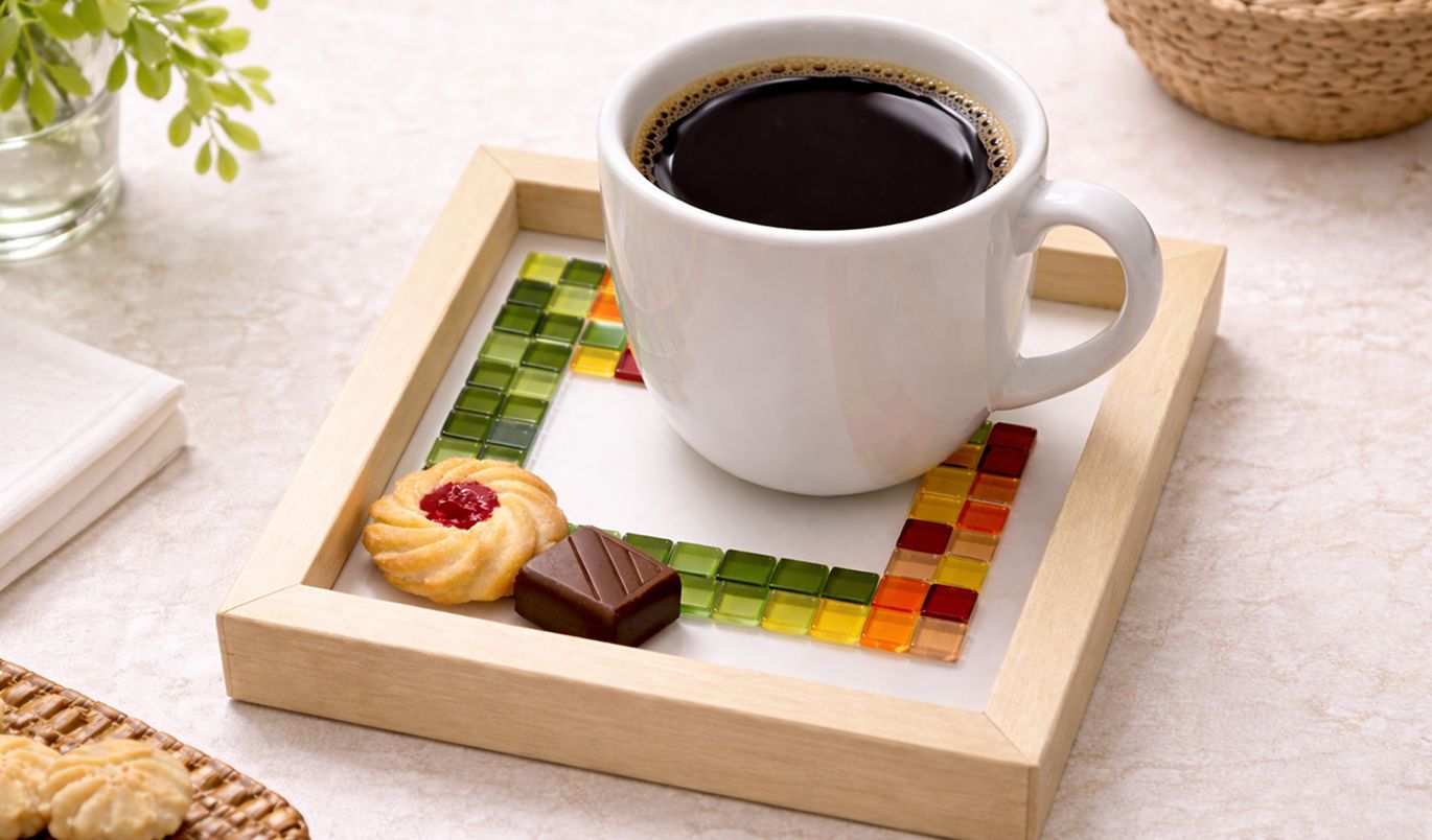 カラフルなガラスタイルを自由に組み合わせ、モザイク模様のトレーコースターをつくれます。色や形のバランスを考えながら、少しずつ模様をつくっていく過程も魅力のひとつです。完成した作品は日常のティータイムを彩るアイテムとして使えるほか、インテリアとしてお部屋に飾ることもできます。